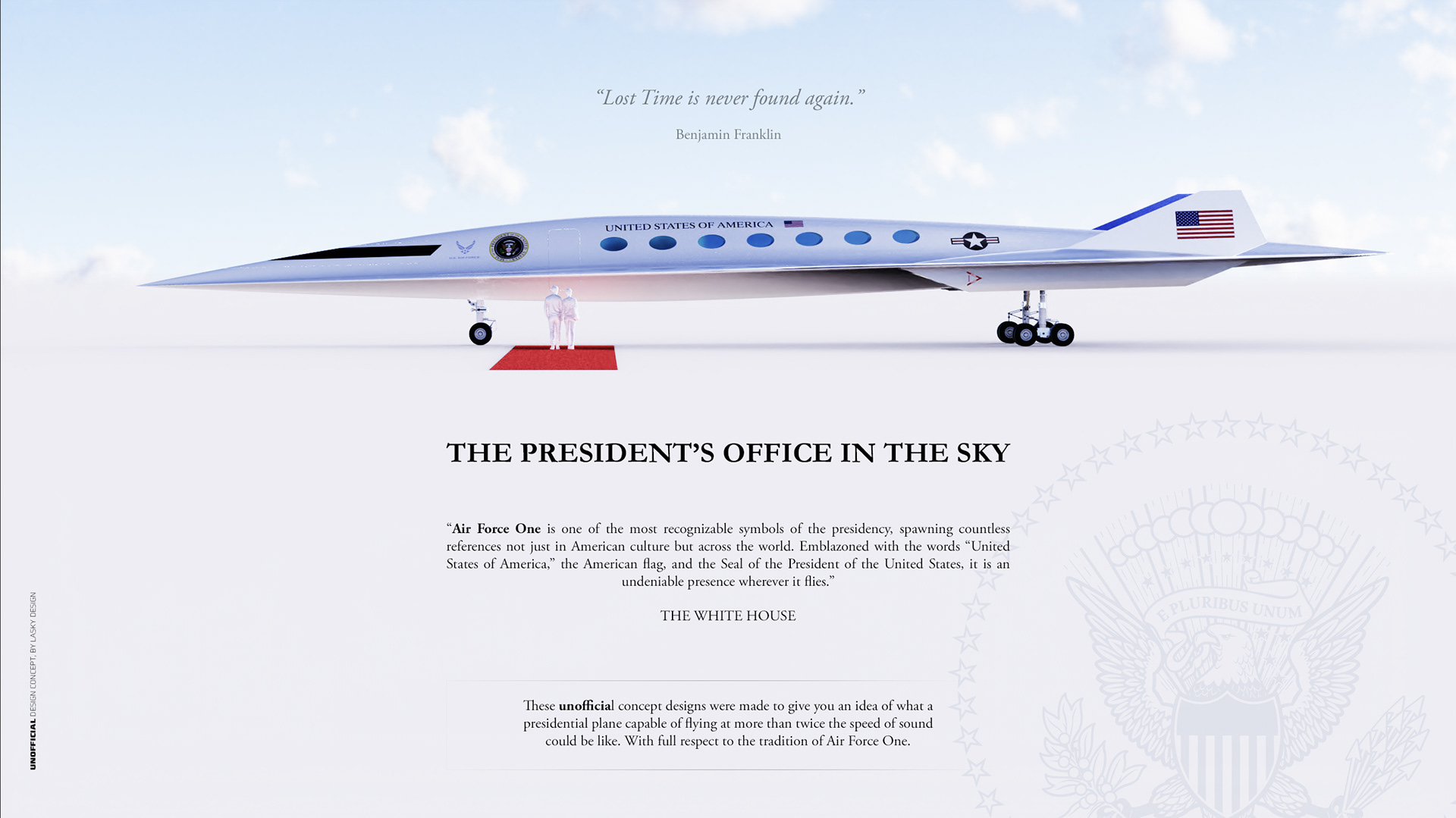 These unofficial concept designs were made to give you an idea of what a presidential plane capable of flying at more than twice the speed of sound could be like. With full respect to the tradition of Air Force One.