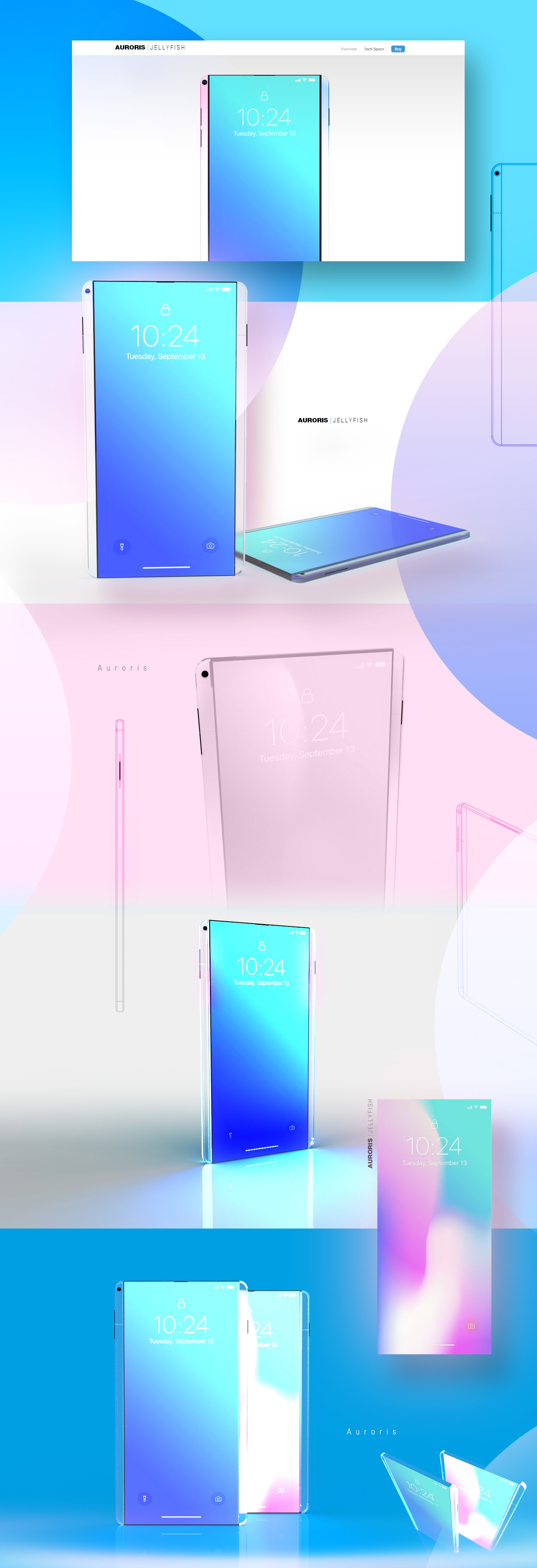 AURORIS is fantasy name of my cellphone concepts. Jellyfish is something progressive, something bright. It has "end-to-end" screen, and transparent frames both sides. (Nothing special.) I put OLEDs on the edge of the display inside, and I want some light motion effects using them. For example when the phone alerts you it is glowing and make some edge light. The edge light is customisable. Colours, motions and so on... The transparency and the edge-light refers to "northern lights" and "Jellyfishes".